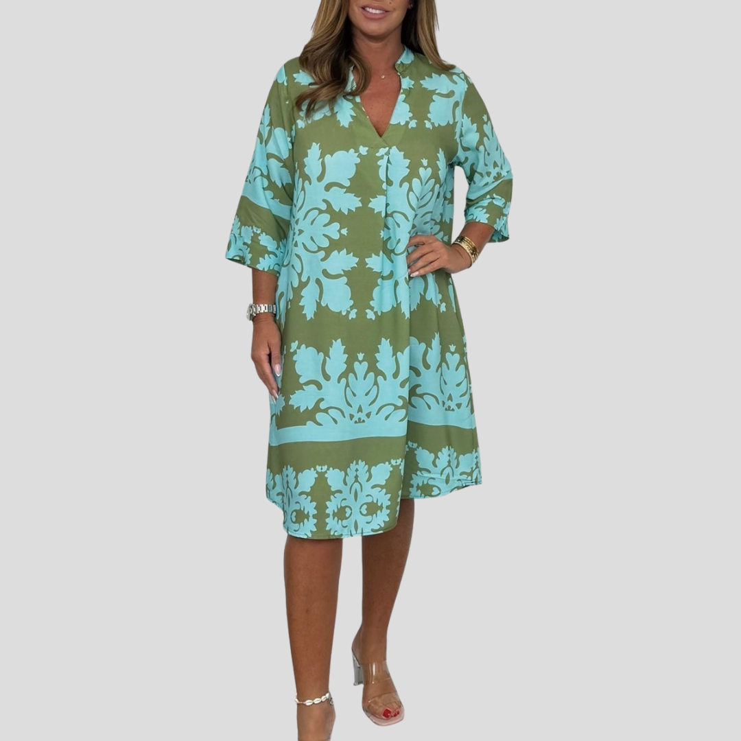 Mit schmeichelndem V-Ausschnitt, stilvollen Mustern und langen Ärmeln bietet dieses Kleid die perfekte Balance zwischen Mode und Komfort. Der lockere Schnitt sorgt für einen luftigen und entspannten Look – ideal für jede Gelegenheit.